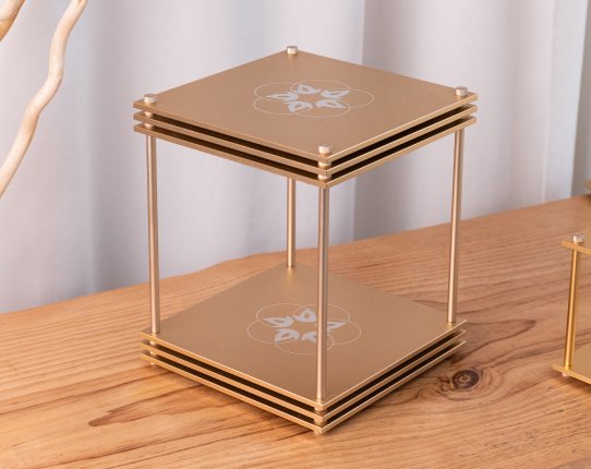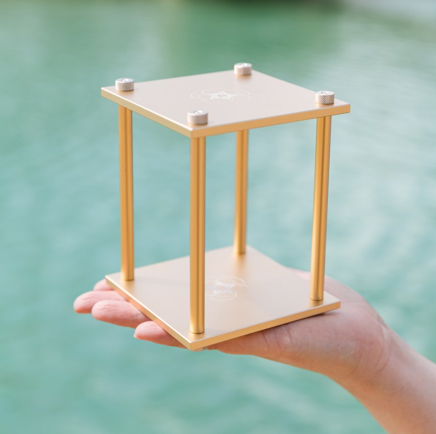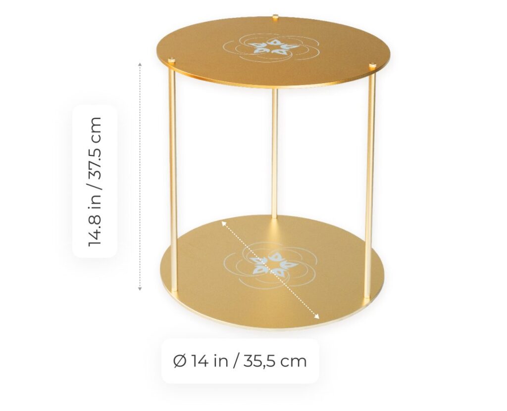 Unlike our other blocs, the Super Bloc is available in a round or square shape. The round design has two round plates with three poles and a diameter of 14 in (35.5 cm) and a height of 14.8 in (37.5 cm). The square design has two square plates with four poles, measuring 15 × 15 × 15 in (38 × 38 × 38 cm). The EMF harmonizing radius is 328-1,970 ft (100-600 m). The shape allows you to charge items that might not fit so easily in our other, square-shaped blocs.