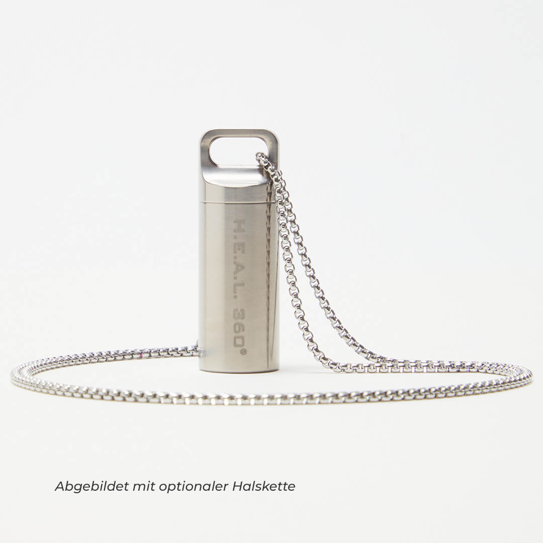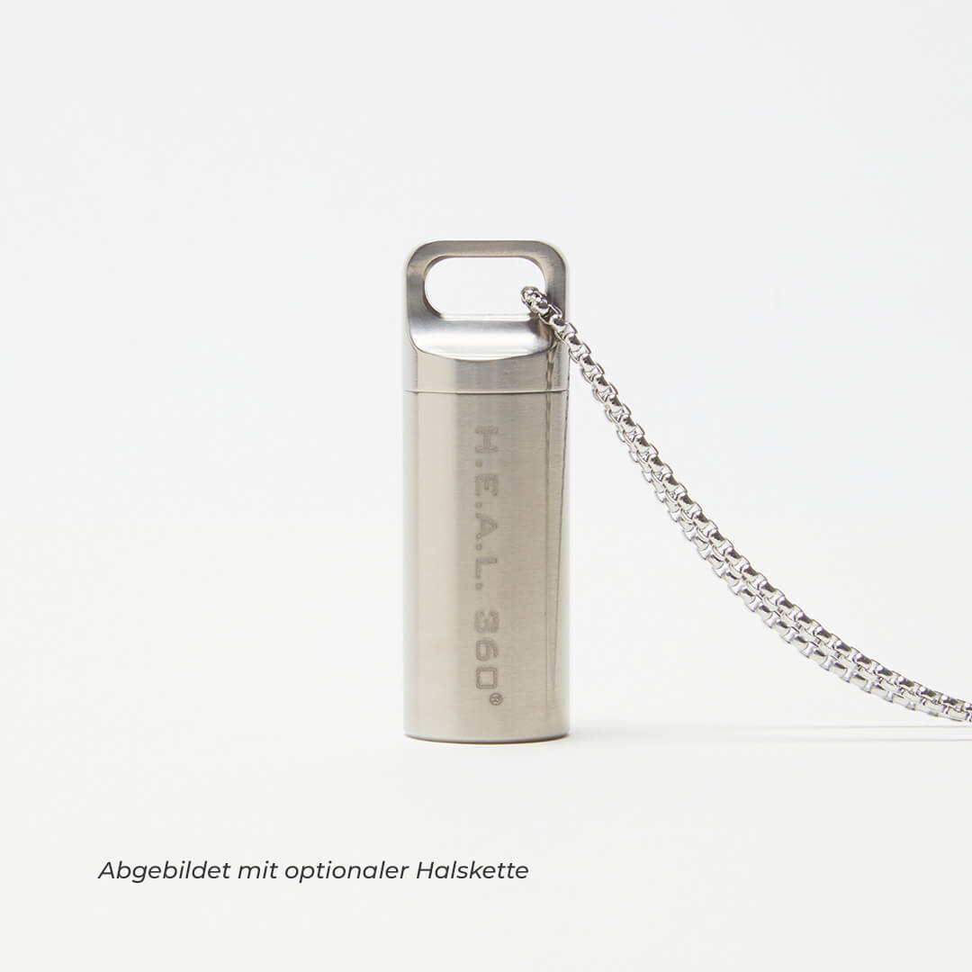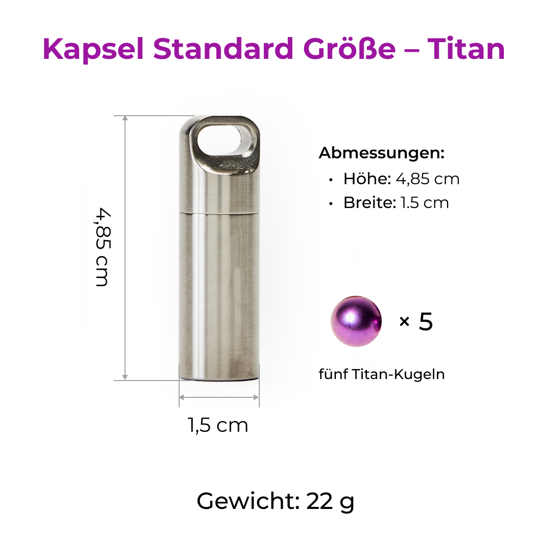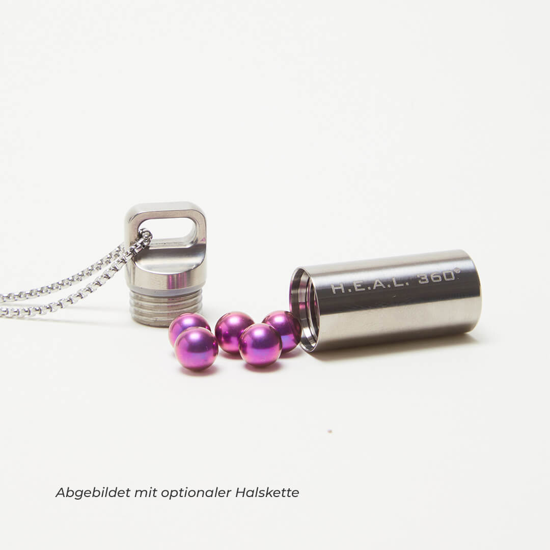 Diese H.E.A.L.360™ Kapsel besteht aus silberfarbenem Titan. Alternativ gibt es sie als Petite Version oder als als goldfarbene Messingkapsel erhältlich, falls Ihnen diese Farbgebung oder das Material mehr entspricht. Bei den Kugeln, sowohl bei der Titan- als auch bei der Messing-Variante, handelt es sich immer um Titankugeln.