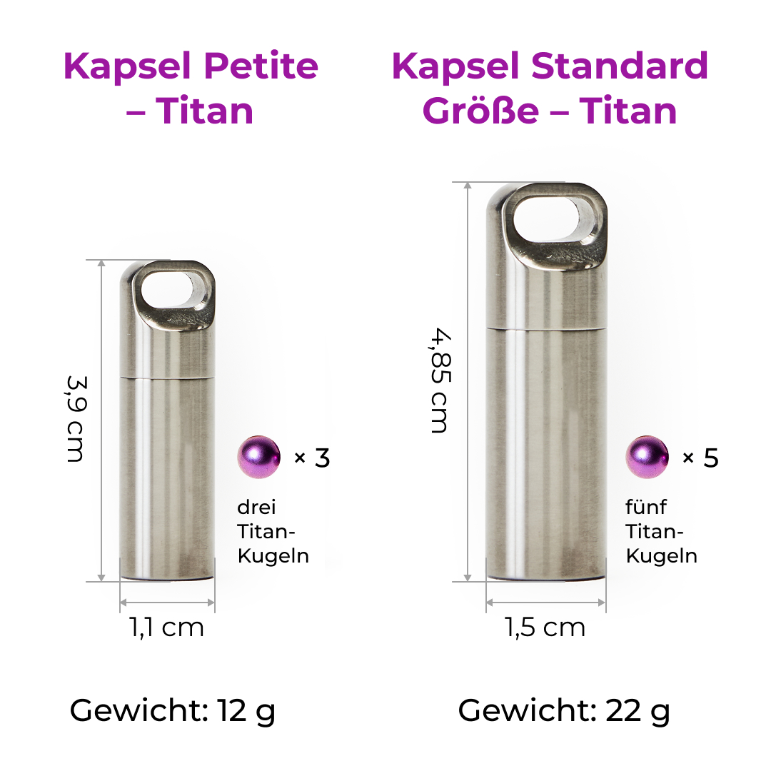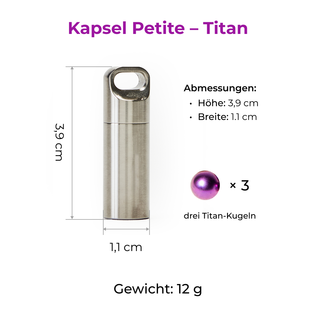 Wie alle unsere Kapseln Petite enthält sie drei mit Quantenenergie versehene Titankugeln – über die Anzahl der in die Kapsel gefüllten Kugeln können Sie die Intensität des Energieniveaus dem persönlichen Bedürfnis entsprechend anpassen.